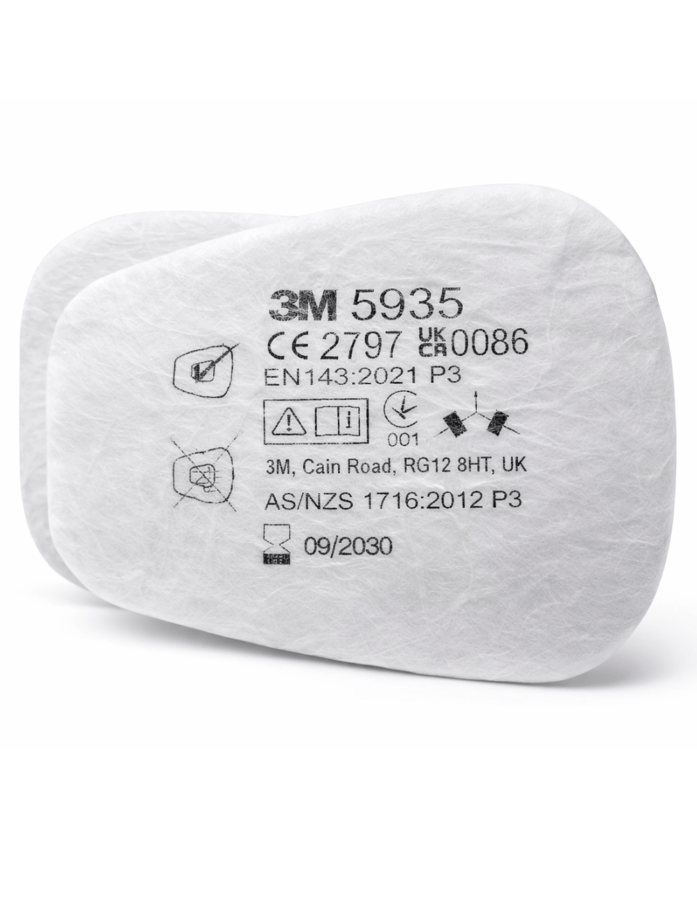 3M 5935 kietųjų dalelių filtras su P3 apsaugos klase ir baltu žymėjimu atitinka EN 143 standartą. Šis modelis efektyviai apsaugo kvėpavimo takus nuo labai toksiškų kietųjų ir skystųjų dalelių. Jis suderinamas su 3M puskaukėmis ir pilno veido kaukėmis.