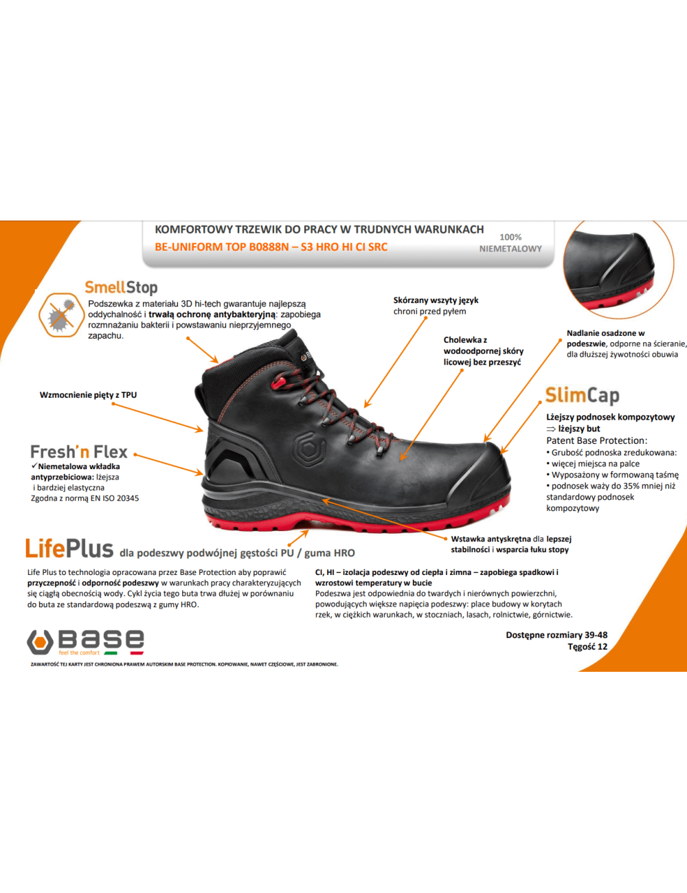 Jei ieškote batų, kurie gerai atlaikytų šlapias sąlygas, leistų saugiai vaikščioti per balas ar dirbti lyjant stipriam lietui, Base Protection „ Be Uniform Top yra puikus pasirinkimas! Šie darbo batai pagaminti iš vientiso odos gabalo, siekiant sumažinti siūlių ir jungčių, galinčių sukelti pažeidimus, skaičių. Pačiuose batuose yra Kevlaro pradūrimui atsparus įdėklas ir kompozitinė nosies apsauga, kad sumažėtų svoris ir padas būtų lankstesnis. Padas taip pat sukurtas sąlygoms, kurioms būdingas nuolatinis vandens buvimas, todėl užtikrinamas ir sukibimas, ir patvarumas.