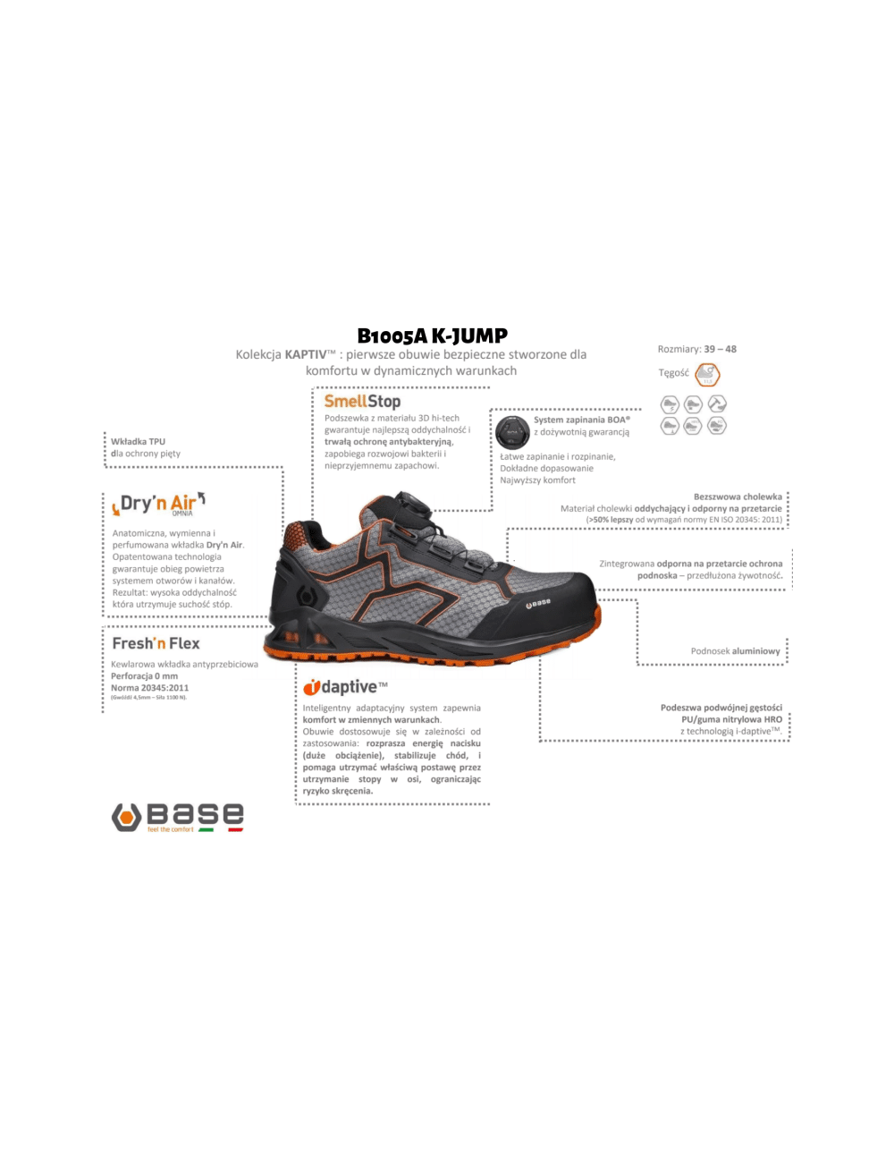 BASE K-JUMP S1P darbo batai sujungia itališką stilių su moderniomis technologijomis ir komfortu. Įrengti I-daptive amortizacijos sistema, jie užtikrina puikų komfortą ir aukštą saugumo lygį.