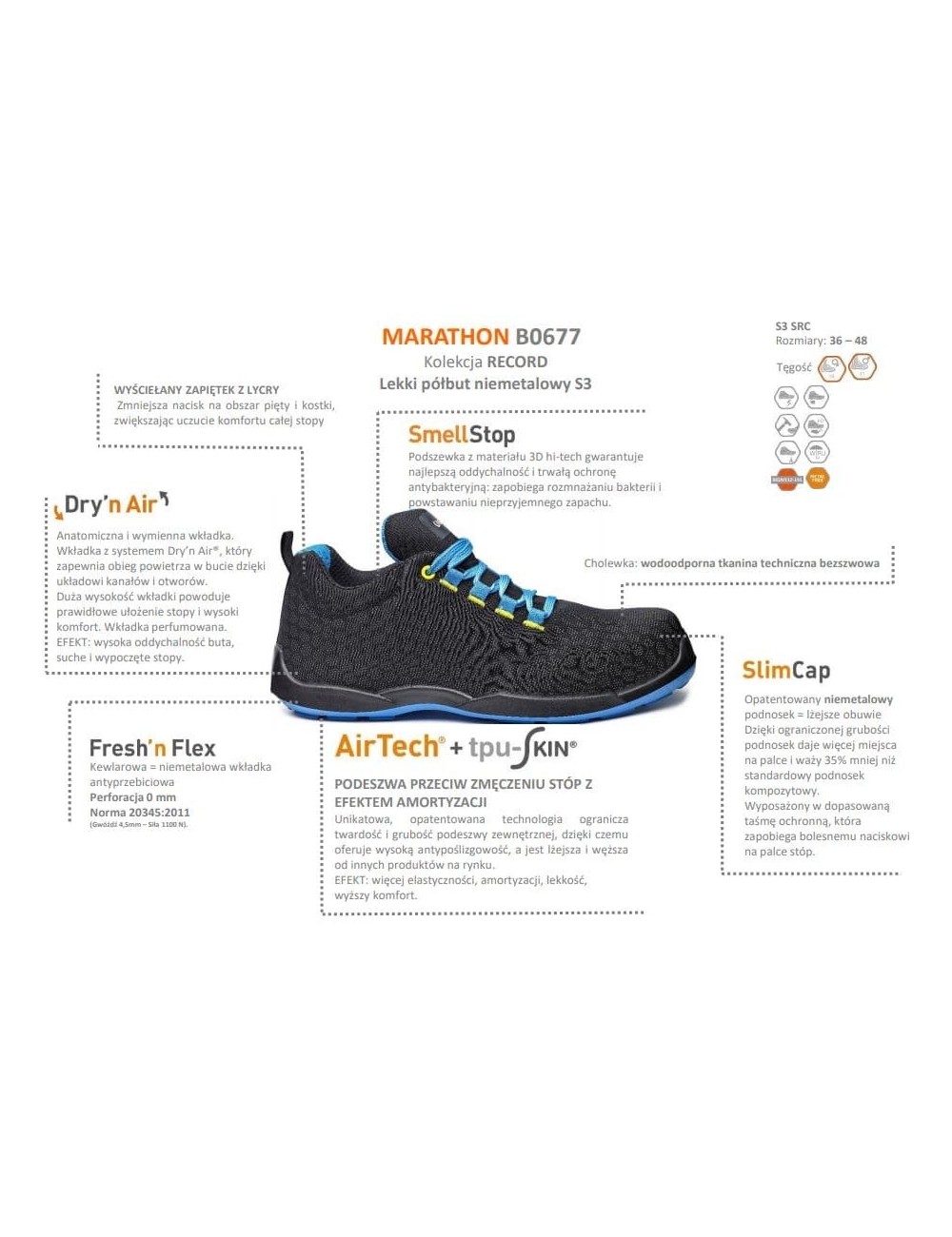 „BASE Marathon darbo batai yra naujausias „Record“ serijos modelis, pasižymintis puikiu komfortu. Puiki amortizacija palengvins jūsų pėdų apkrovą, ypač kai ilgas valandas praleidžiate ant kojų. Storas, perforuotas vidpadis užtikrina tinkamą amortizaciją ir pašalina drėgmę nuo pado, kad jūsų pėdos būtų sausos ir patogios. S3 apsaugos klasė suteikia visišką pėdų apsaugą nuo mechaninių pavojų. Kompozitinė pirštų apsauga apsaugo pirštus, o sintetinis apsauginis vidpadis nuo pradūrimų apsaugo pėdą, jei užminti ant vinies ar kito aštraus daikto. Ryškios spalvos ir modernus Marathon dizainas daro šį modelį puikiu pasirinkimu ne tik statybvietėse ar sandėliuose, bet ir biure. „Base Marathon yra populiarus pasirinkimas ne tik kaip darbo batas, bet ir vadovams, inžinieriams bei biuro darbuotojams.