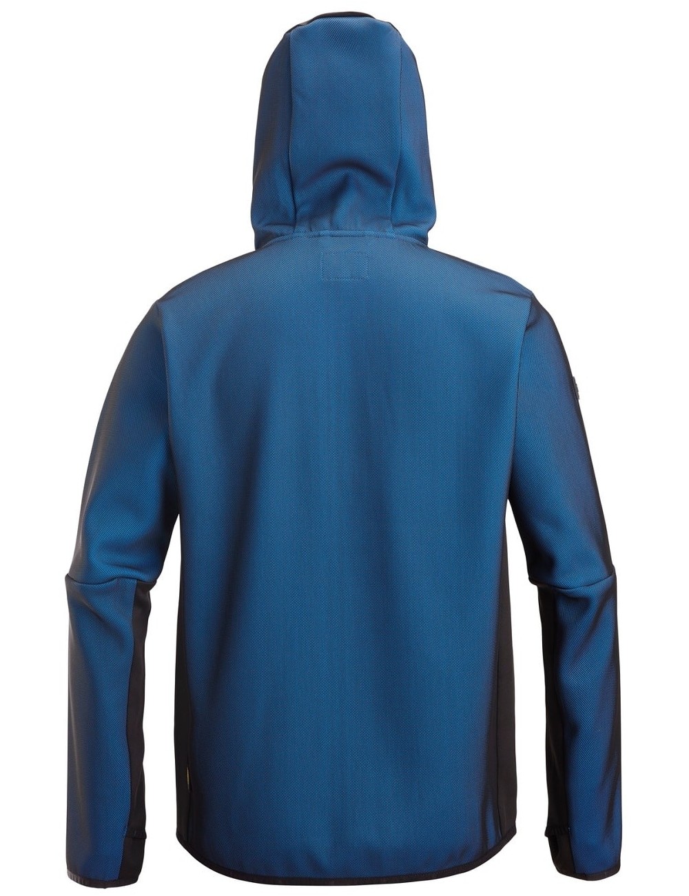 Bluza męska Snickers 8044 z kolekcji FlexiWork to nowoczesny model, który jest przyjazny środowisku. Wykonana jest z dwuwarstwowego materiału typu mesh/interlock – tkaniny siatkowej o gęstym splocie, który zawiera wysoką ilość poliestru pochodzącego z recyklingu. Niespotykanie wysoka gramatura materiału – aż 390 g/m2 gwarantuje niezwykłą trwałość. Dzięki zastosowaniu elastycznego materiału oraz profilowanych rękawów model ten zapewnia doskonałą swobodę ruchu. Bluza robocza zasuwana jest na suwak błyskawiczny. Otwory na kciuki w mankietach zapobiegają podwijaniu się rękawów. Bluza z kapturem ozdobiona jest odblaskowy i świecącym w ciemności nadrukiem na kapturze. Wyposażona jest w 2 kieszenie boczne oraz 1 na piersi zasuwane na zamek błyskawiczny, a także 2 kieszenie wewnętrzne. Doskonale sprawdzi się w łagodnych warunkach jako warstwa wierzchnia, jak i w zimnych pod kurtką.