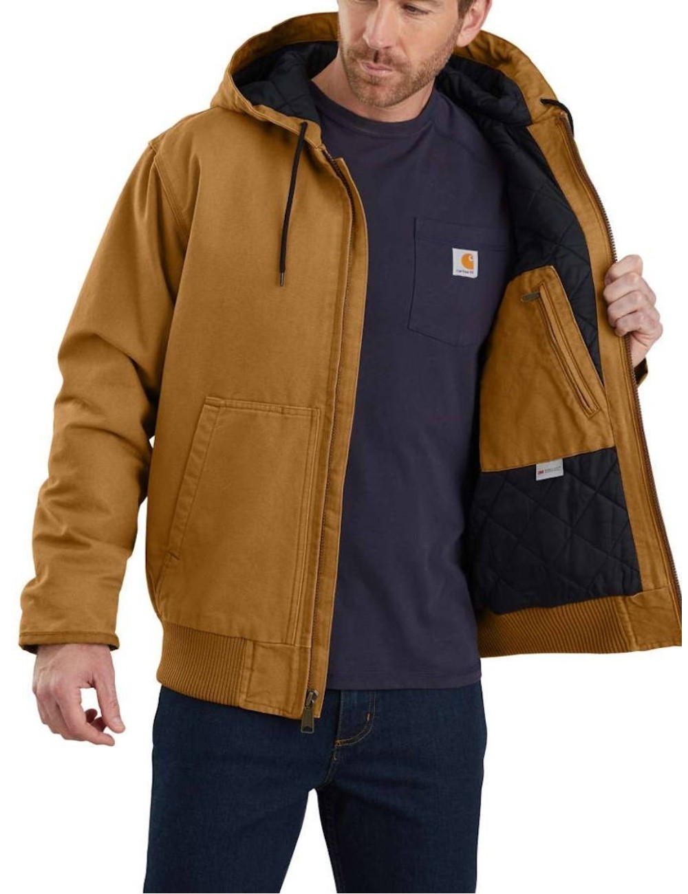 Carhartt Duck Active Jacket atspindi tipišką amerikietišką darbo aprangos stilių. Paprastas, santūrus stilius, primenantis kasdienį dėvėjimą, ir pagrindinės, prislopintos spalvos yra Carhartt drabužių skiriamieji bruožai. Sunkus Washed Duck išorinis audinys yra itin patvarus ir atsparus pažeidimams. Washed Duck yra tvirtas austas drobės audinys (galbūt jį atpažinsite iš „Ruff Work“ darbo kelnių). Striukė, sukurta laisvo kirpimo, yra erdvi ir leidžia nevaržomai judėti. Šio modelio izoliaciją užtikrina patikrintas ir gerbiamas 3M ™ Thinsulate ™ prekės ženklas, paslėptas po dygsniuotu pamušalu, užtikrinantis šiluminį komfortą ir izoliuojantis nuo šalto oro. Platus raišteliu surišamas juosmuo neleidžia šaltam orui išeiti.