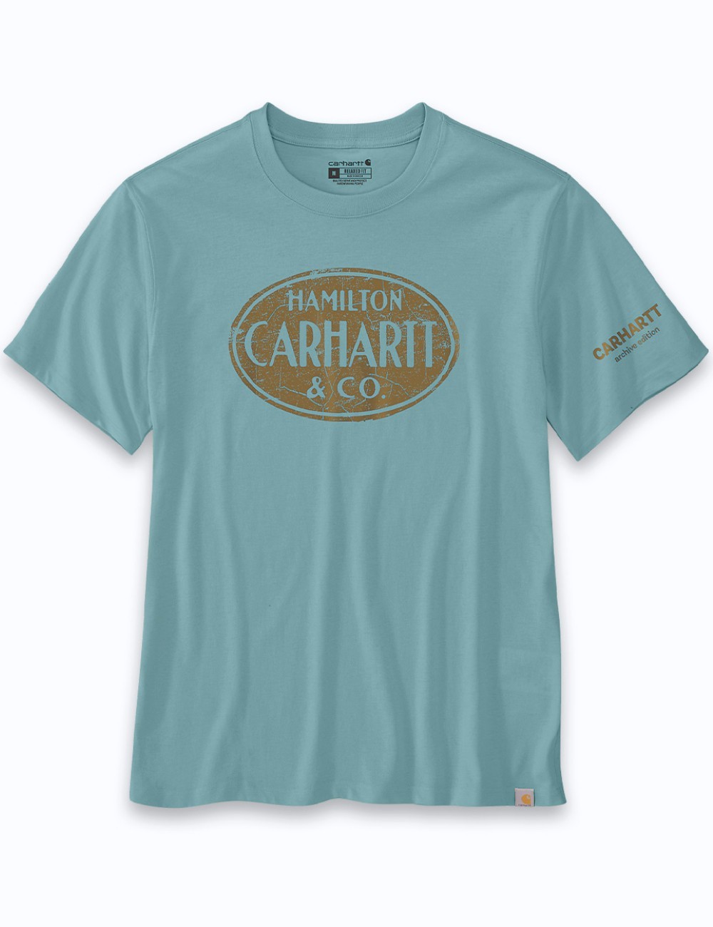 - Hamilton Carhartt Logo ant krūtinės, pabrėžiantis marškinėlių charakterį