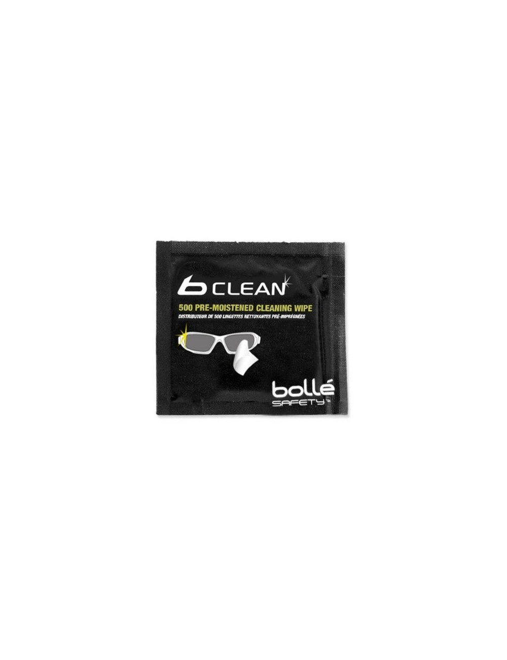 Chusteczka do czyszczenia wizjera okularów ochronnych i wizjerów nasączona płynem Bolle B-Clean, niepozostawiająca śladów, zapewniająca czyszczonej powierzchni właściwości antystatyczne i antyrefleksyjne.