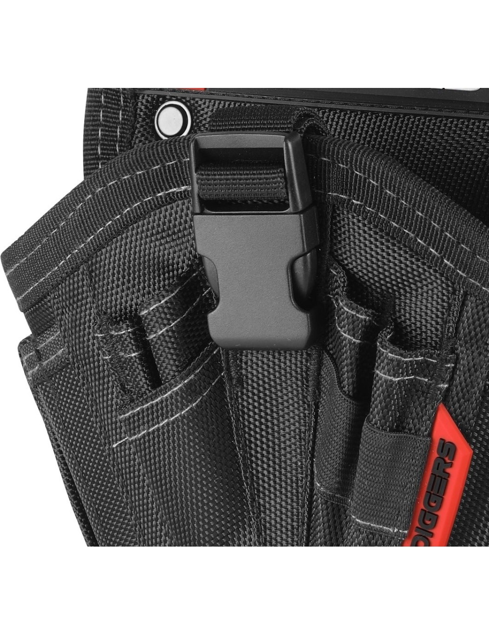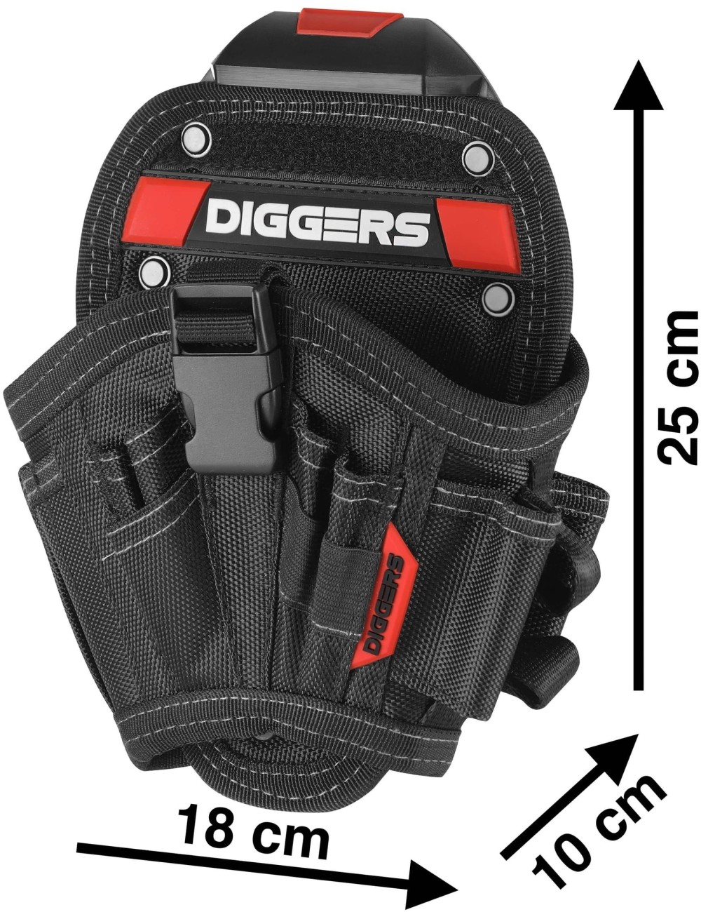 Diggers Medium Drill Pouch Holster iš itin patvarios medžiagos, sutvirtintos tvirtomis kniedėmis. Jis puikiai tinka net ir pačioms sudėtingiausioms darbo aplinkoms. Šis modelis turi 13 kišenių ir kilpų, įskaitant kišenę priedams, antgalių laikiklius, atsuktuvų laikiklius ir karabinų kilpas. Įrankių dėklas skirtas tiek dešiniarankiams, tiek kairiarankiams. Jame yra novatoriška Quick Click tvirtinimo sistema, leidžianti greitai ir lengvai pritvirtinti prie bet kokio įrankių diržo. Tai revoliucinis būdas profesionalams nešiotis ir laikyti įrankius.