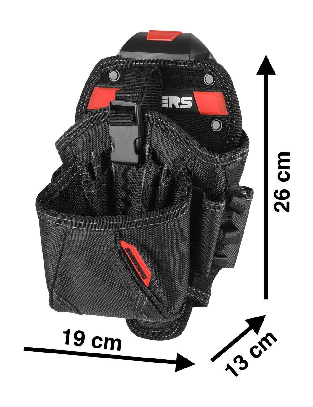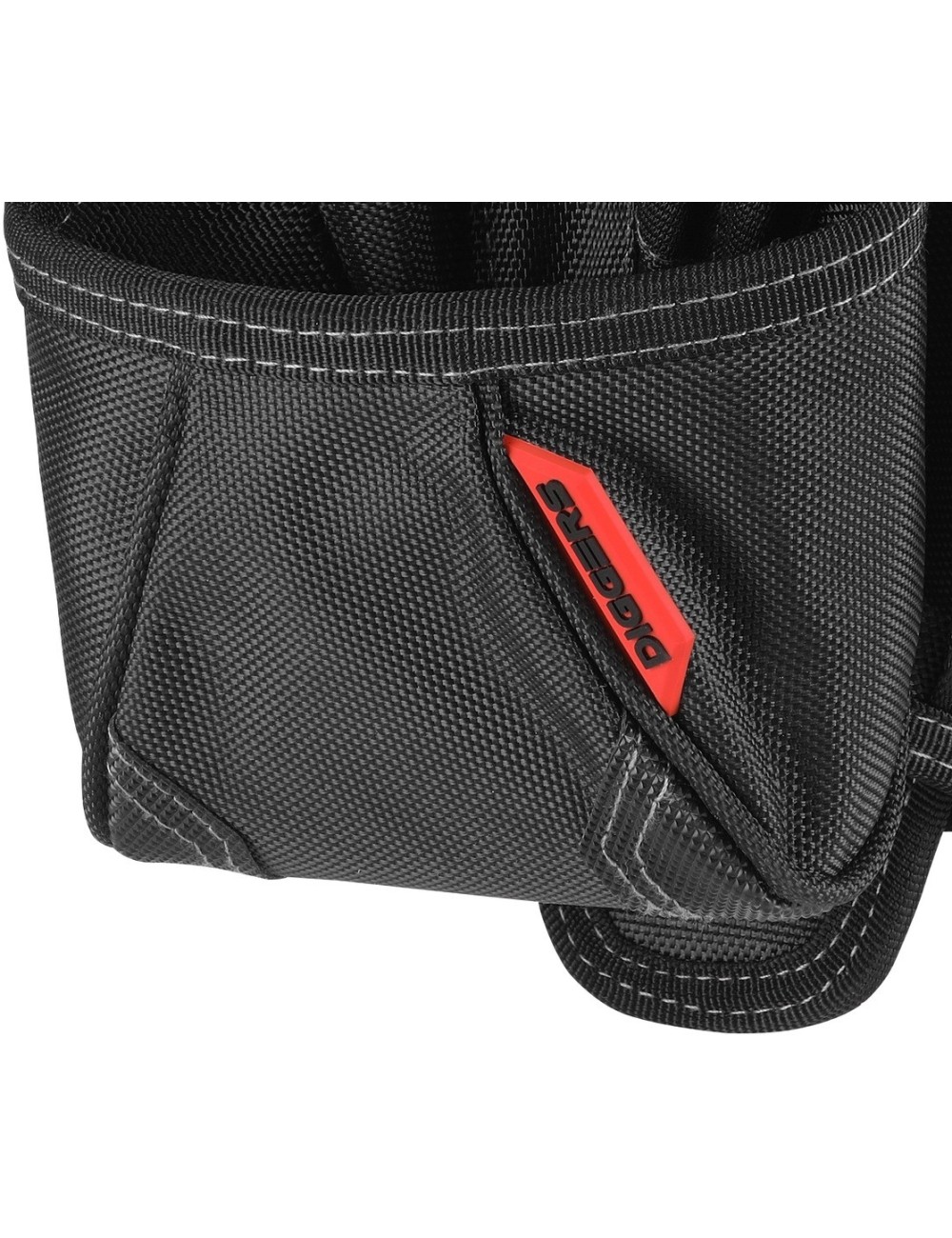 Duża kieszeń z przeznaczeniem na wkrętarkę Diggers Large Drill Holster Pouch wyposażona jest w innowacyjny system mocujący Quick Click, dzięki któremu można zamocować ją w niemal dowolnym miejscu. Doskonała jest do transportowania narzędzi po przymocowaniu do pasa narzędziowego. Świetnie sprawdzi się także jako samodzielne akcesorium. Kabura na wkrętarkę dobrze spisze się nawet w najcięższych warunkach. Wykonana jest z bardzo wytrzymałego materiału. Wzmocniona dodatkowo solidnymi nitami. Wyposażona jest łącznie w 13 kieszeni i pętli, w tym jedną zakrytą kieszeń na akcesoria, 2 pętle na wkrętaki oraz 7 kieszonek na bity. Przeznaczona jest zarówno dla prawo, jak i leworęcznych użytkowników.