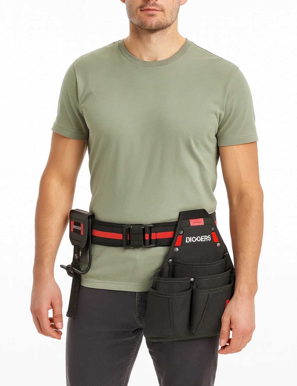 Praktiškas Diggers įrankių krepšių rinkinys, skirtas staliams, kurį sudaro DK538 įrankių diržas, plaktuko laikiklis ir didelis DK522 įrankių krepšys. Peržiūrėkite pridedamus elementus: