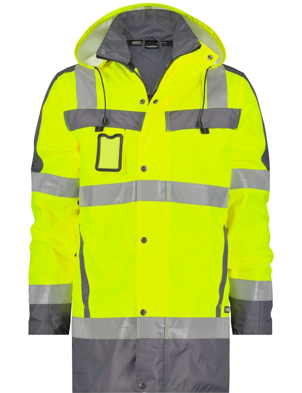 Pozostań widoczny i bezpieczny podczas zimowych, mroźnych dni w pracy. Długa kurtka robocza typu parka Dassy Limasol to doskonały wybór dla osób poszukujących ochrony przed zimnem, wiatrem i deszczem którym zależy również na ostrzegawczych kolorach i odblaskowych pasach.
