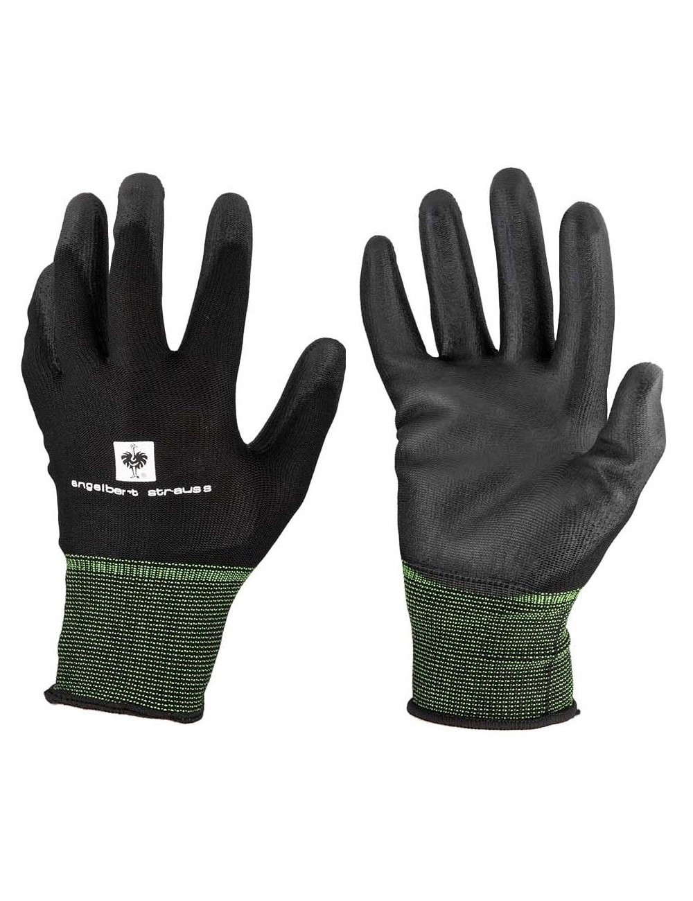 Rękawice robocze Engelbert Strauss wykonane z dzianiny poliestrowej, która zapewnia oddychalność dłoni podczas pracy. Część chwytna rękawicy pokryta jest odporną na zużycie, antypoślizgową powłoką poliuretanową. Powłoka ta sprawia, że rękawice mają doskonały chwyt i są wytrzymałe. Rękawice robocze są bardzo elastyczne, dzięki czemu świetnie dopasowują się do ręki. Przeznaczone są do precyzyjnych prac, gdzie bardzo ważna jest zręczność manualna. Długość rękawicy to około 25 cm.