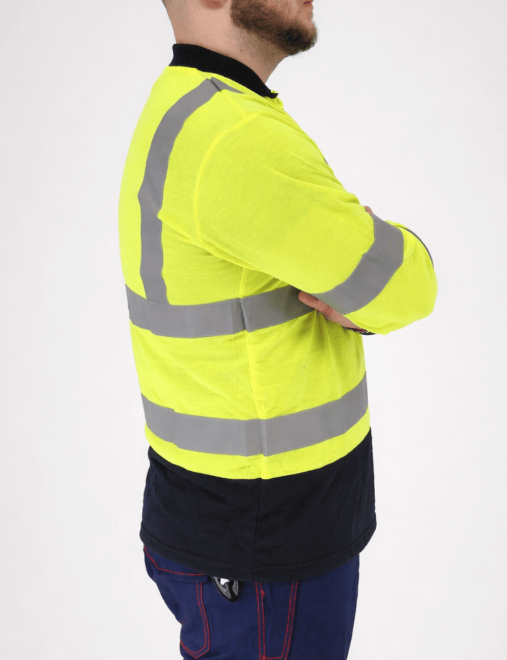- Antistatinė medžiaga – marškinėliai pagaminti iš 99 % poliesterio su antistatinio pluošto priedu, kuris riboja elektrostatinių krūvių kaupimąsi ir padidina darbo saugą iškrovų rizikos zonose.