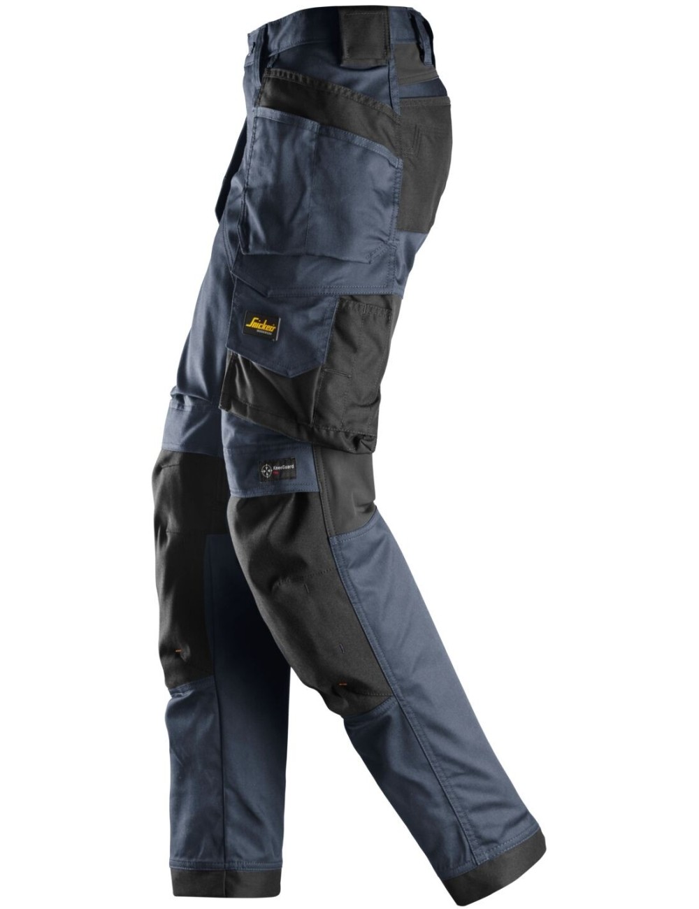 Snickers Workwear kelnės pagamintos iš visiškai elastingo, dvikrypčio tempimo audinio. Papildomos keturiomis kryptimis tempiamos plokštės nugaroje suteikia dar didesnę judėjimo laisvę. Šis modelis leidžia visada su savimi turėti svarbiausius įrankius ir priedus! Be funkcionalių dėklinių kišenių, kelnėse taip pat yra kišenė liniuotei su peilio laikikliu, kišenė ant kojų, daugybė kilpų ir rankenų bei kišenė su asmens tapatybės kortelės laikikliu. Dar didesniam patogumui kelnėse yra kišenės ant kelių su KneeGuard sistema (atitinka EN14404). Siekiant didesnio patvarumo, tiek keliuose, tiek dėklinėse kišenėse yra Cordura sutvirtinimai.