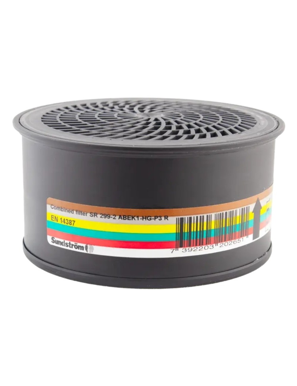 Sundstrom SR 299-2 ABEK1-Hg-P3 R“ daugiafunkcis dujų filtras yra pažangus ir universalus kombinuotas filtras, sudarytas iš ABEK1 daugiafunkcio dujų filtro, aukščiausios klasės P3 kietųjų dalelių filtro ir gyvsidabrio garų dujų filtro. Sukurtas naudoti „Sundström“ viso veido ir pusės kaukėse. SR 299-2 filtro maksimalus bendras veikimo laikas yra 50 darbo valandų.